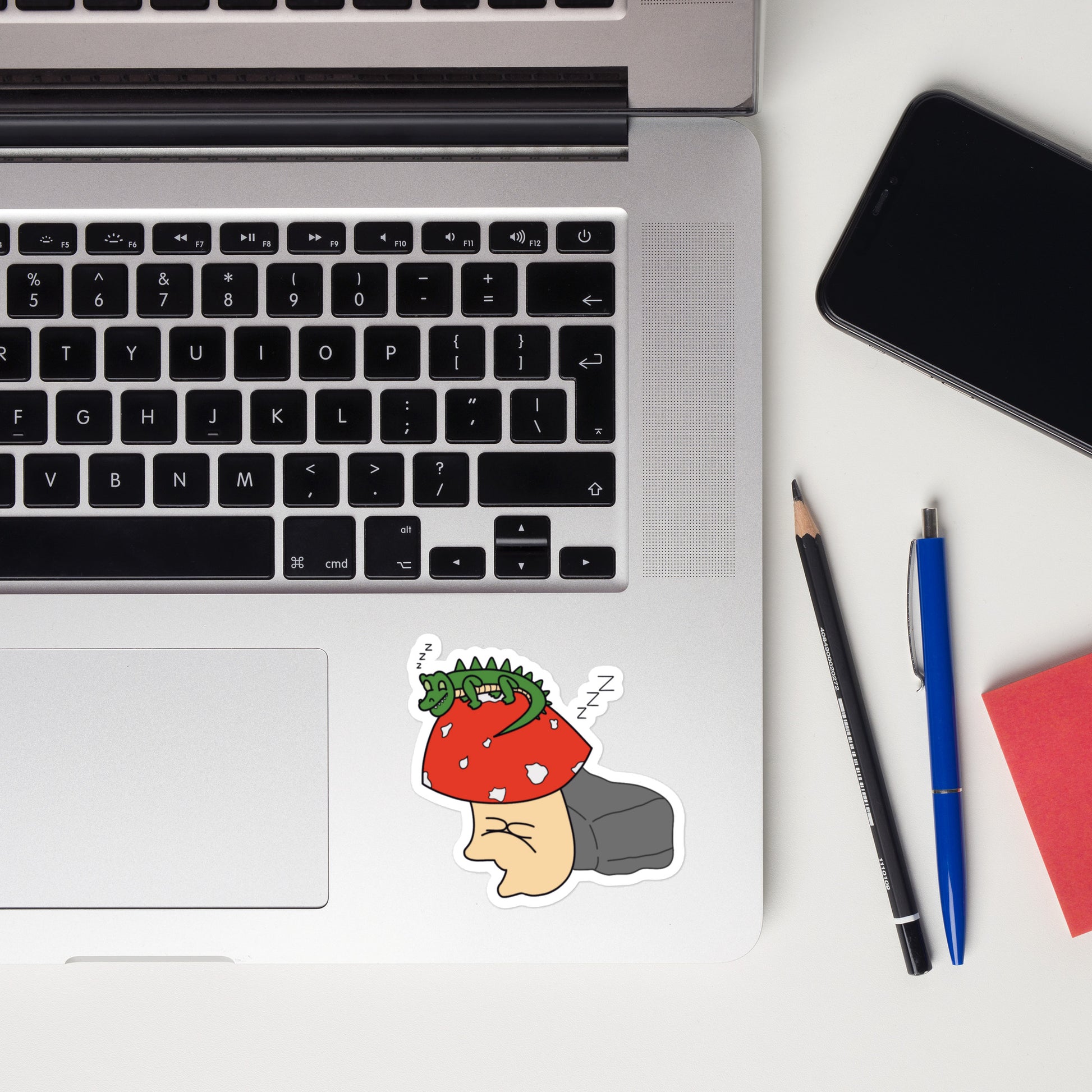 Introducing Reptor, the charming Mushie who’s blissfully dozing off with his loyal lizard friend curled up on his head! This enchanting sticker captures the magic of relaxation, where these two sleepy companions drift into a world of dreams together. With its warm, soothing vibes and whimsical charm, this sticker is perfect for adding a touch of coziness and character to your laptops, water bottles, notebooks, or any space in need of some adorable, peaceful energy.